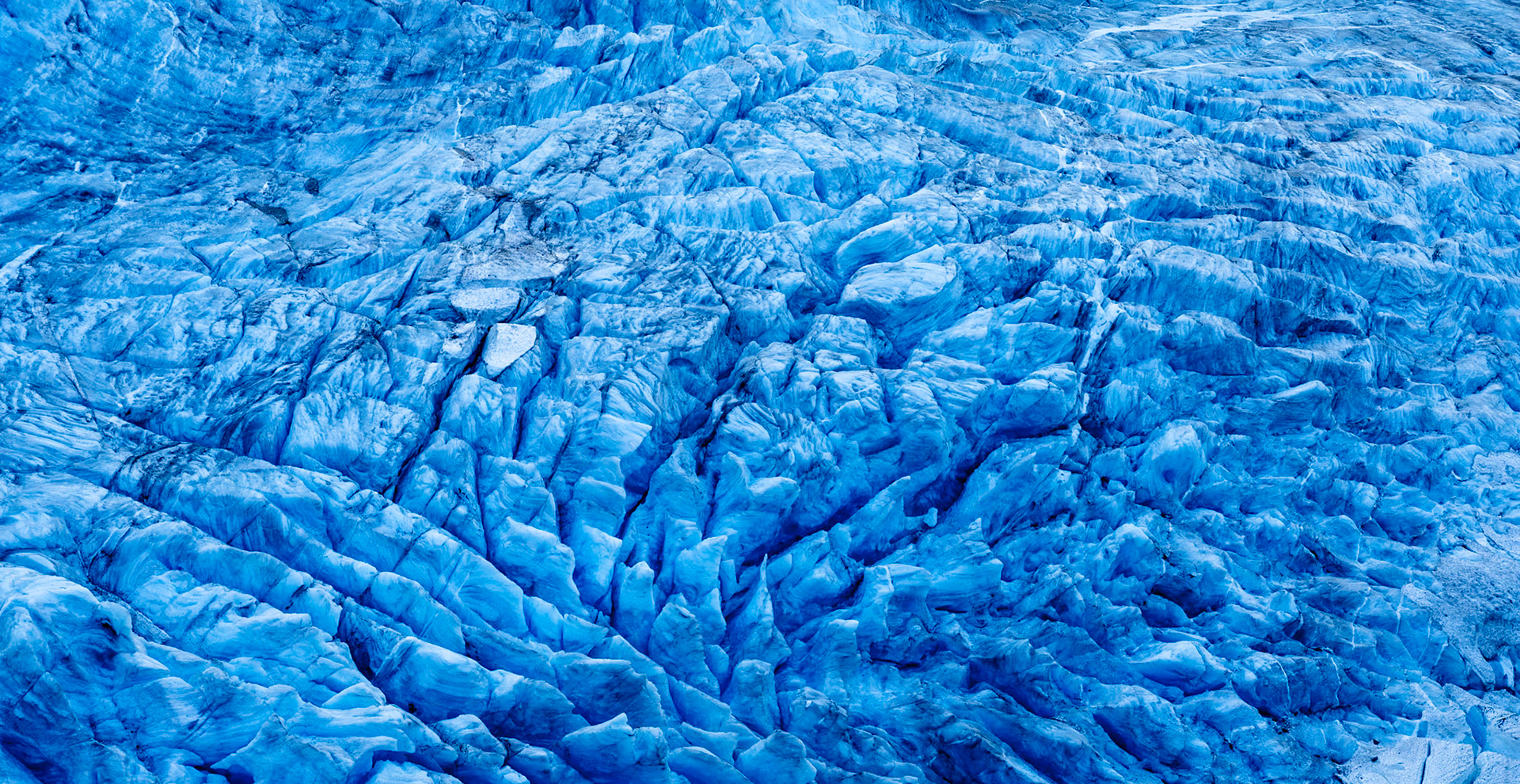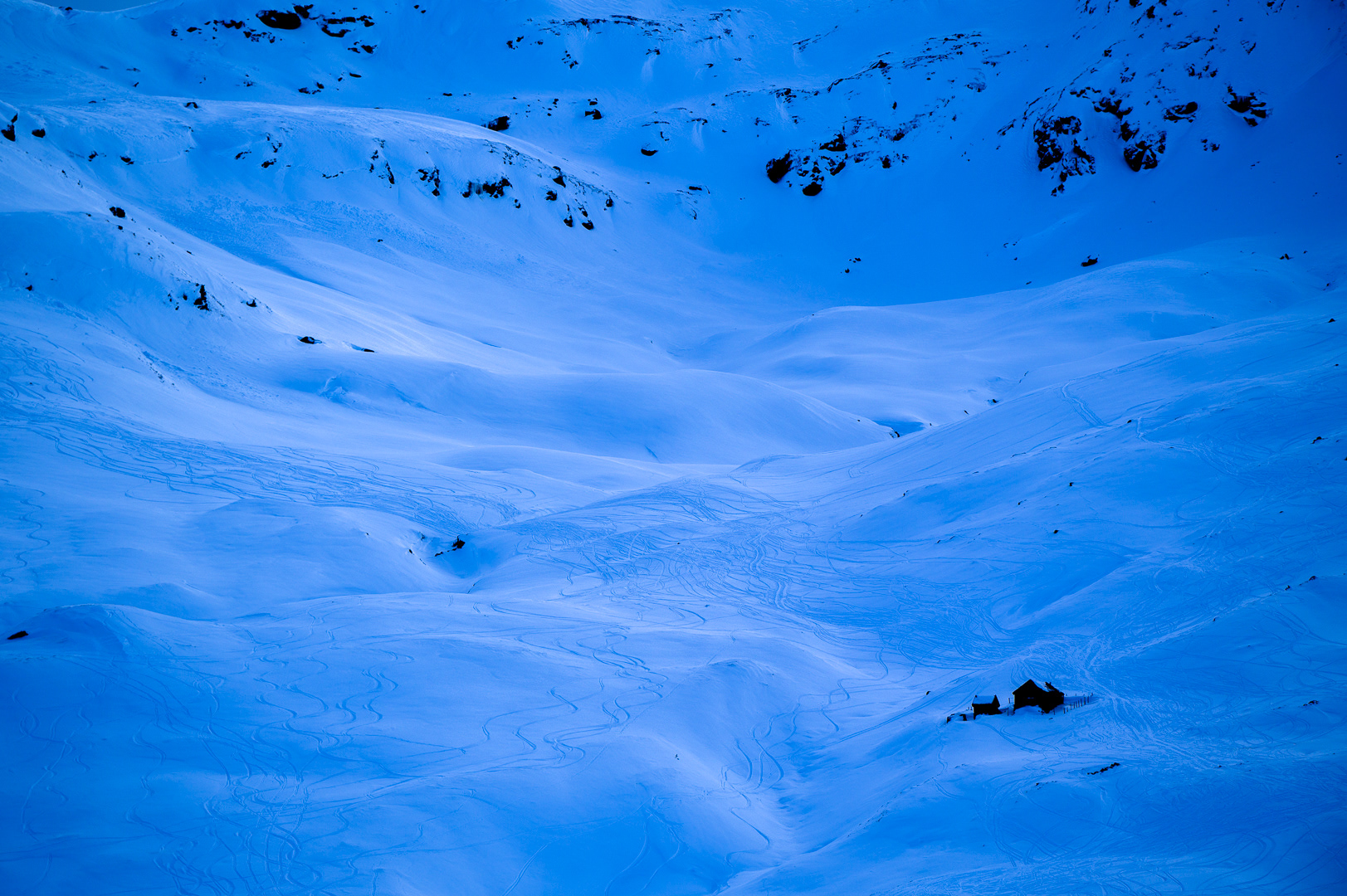 The clear sky colored the snow blue.